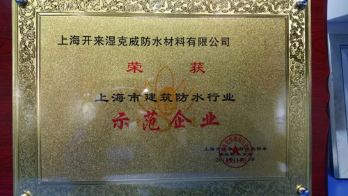 2017年11月10日,在以“十年防水同舟路 綠色創新筑未來”為主題的上海市建筑防水行業協會十周年年會上,上海開來濕克威防水材料有限公司被授予“上海市建筑防水行業示范企業”榮譽!