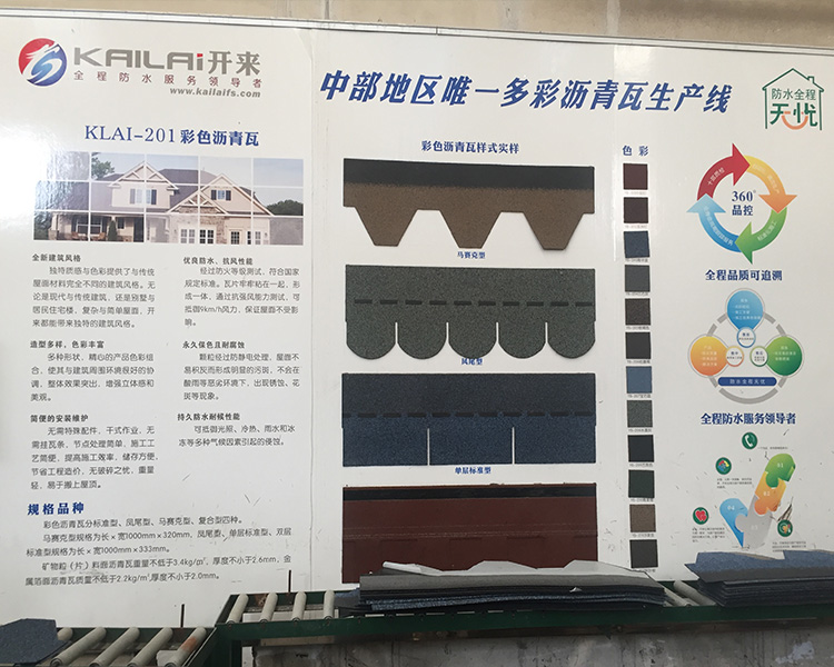 KLAI-201彩色瀝青瓦是以玻璃纖維氈為胎基,經浸涂中石化優質石油瀝青后,一面覆蓋燒結彩色礦物粒料、另一面撒以隔離材料所制成的瓦狀屋面防水片材。公司擁有中部地區特有的彩色瀝青瓦生產線,對外提供定制。采用在高溫下陶化而成的彩色燒潔砂,產品采用全背膠生產工藝。彌補了瀝青瓦抗風性能差的缺點,造型多樣,色彩豐富。